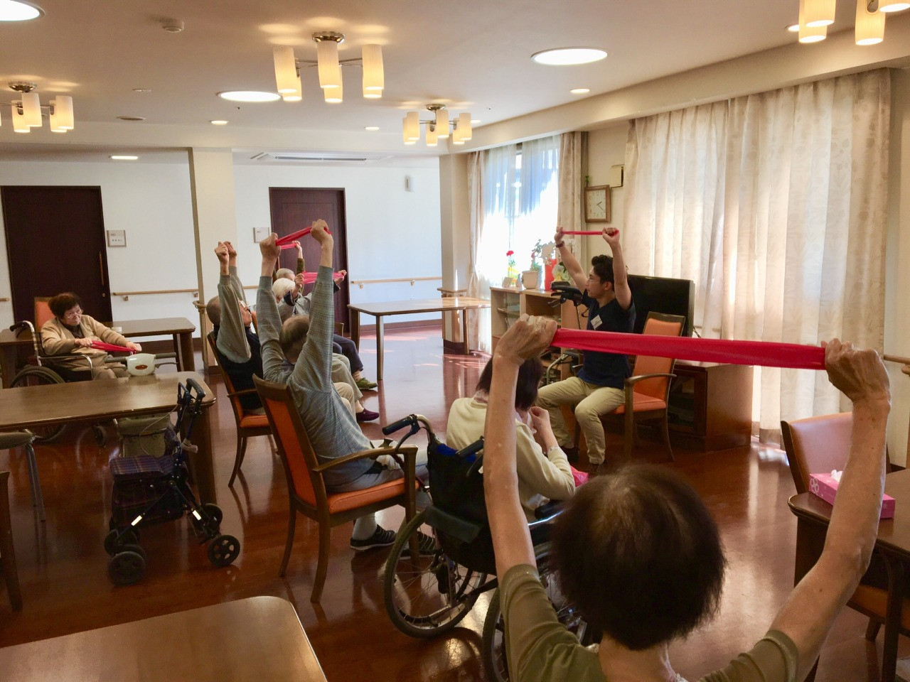 主治医やケアマネージャーに「リハビリテーション報告書」および「計画書」を適宜提出しているため、現在ご自宅や施設にご入所されているご利用者様も安心してサービスを受けることができます。個人宅のみならず、各種施設に直接理学療法士や作業療法士が訪問して行う「グループリハビリテーション」も行っており、車椅子に座ったままでも取り組むことができる運動を実施いたします。もちろん、使用するセラバンド等のアイテムは全てご用意いたしますので、安心してお任せください。