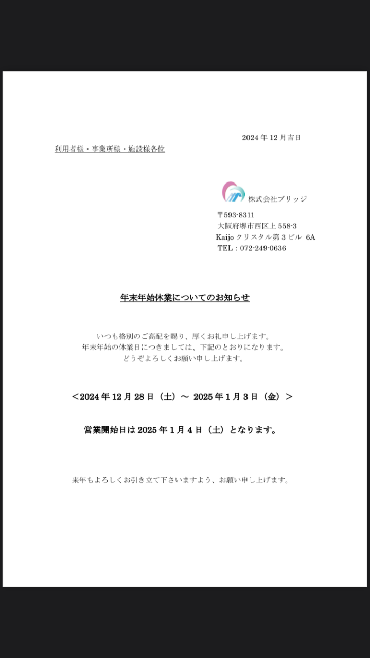 年末年始休業についてのお知らせ 2024/12/21 年末年始休業についてのお知らせ いつも格別のご高配を賜り、厚くお礼申し上げます。 年末年始の休業日につきましては、下記の通りになります。 どうぞよろしくお願いいたします。 〈 2024年12月28日(土)〜2025年1月3日(金)〉 営業開始日は2025年1月4日(土)となります。 来年もよろしくお引き立てくださいますよう、お願い申し上げます。