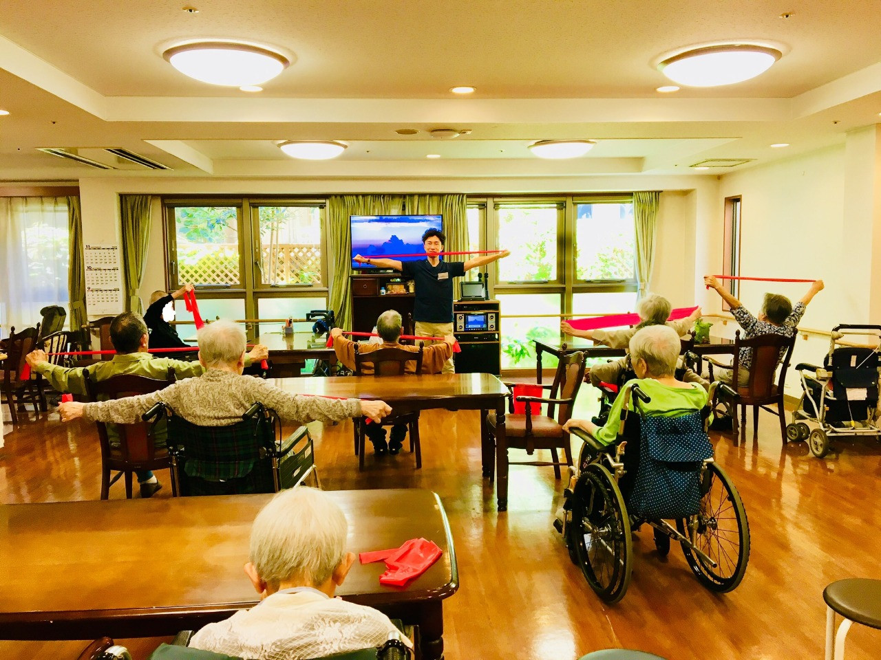 車いすや椅子に座ったまま行える、全身のストレッチや筋力トレーニング、コグニサイズを実施いたします。